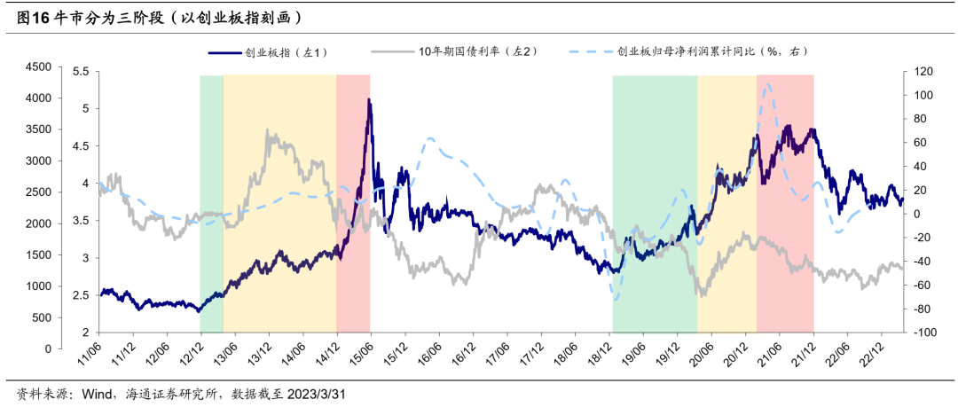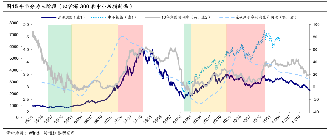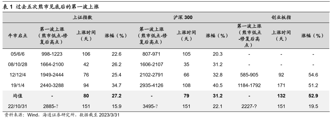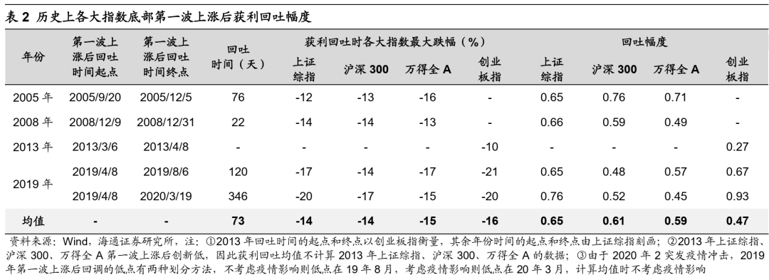 A股处在牛市初期,第一波上涨结束后或进入震荡蓄势阶段。我们在《牛市有三个阶段-20190303》分析过,牛市可以分为三个阶段:第一阶段孕育准备期,第二阶段全面爆发期,第三阶段泡沫疯狂期。去年10月底以来的上涨属于牛市的孕育准备期,这一阶段基本面还未明显改善,市场的上涨主要源自政策宽松和悲观预期修复。回顾此前四轮牛市初期的第一波上涨,上涨时间持续3-4个月,宽基指数涨幅约25%-30%;22年10月至今A股第一波上涨持续近5个月,上证指数最大涨幅16%、沪深300最大涨幅22%。历次熊市见底后第一波上涨行情走完,市场往往会获利回吐,背后的原因是基本面还不够扎实。历次回吐过程中上证指数平均下跌46天(剔除2019年),上证指数、沪深300、万得全A平均回撤13%左右、回吐前期上涨行情0.5-0.7左右的涨幅,详见下表。我们认为,本轮行情结束后的第一次回调的扰动因素主要来自海外,部分国家的债务风险或将暴露;此外,还需持续关注国内宏微观基本面的验证情况。但总的来看,从经济周期和股市周期来看,22年10月底是A股熊转牛的转折点,我们认为短暂回调不改牛市格局,修整蓄势期也是牛市主升浪的布局区。