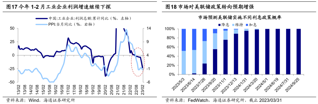 海外风险尚未停歇,盈利复苏尚不扎实,二季度港股或将震荡蓄势。与A股类似,港股去年10月底的低点是熊转牛的转折点。去年10月底以来恒生指数在熊转牛的第一波上涨中最大涨幅达55%,今年1月末以来陷入回撤休整。目前来看港股还处在震荡蓄势阶段,背后原因是海外扰动或尚未结束。尽管硅谷银行和瑞士信贷的风险逐渐平息,但高利率环境仍可能诱发类似事件,市场恐慌情绪也可能成为未来全球金融市场的不稳定因素。如前文所述,当前许多国家和地区存在一定债务风险:土耳其、新兴市场主权债务风险增加,希腊、意大利、西班牙等国家政府部门杠杆率已接近甚至超过欧债危机时期水平;日本实施YCC政策加剧了债务压力。港股市场作为离岸市场,海外危机一旦爆发,难免会受到冲击。从基本面看,尽管短期国内经济已经走向复苏,但传导至上市公司盈利依然需要时间,由于PPI受同期基数较高影响降幅扩大、企业营收降幅大于成本降幅,1-2月份全国工业企业利润同比下降22.9%。4月港股上市公司相继进入业绩发布高峰期,而港股上市公司基本面取决于国内,因而短期港股或面临一定的业绩压力。中长期看,港股流动性和基本面都有积极变化,全年有望向上。流动性方面,全球金融风险也将促使美联储调整加息政策,市场也预期美联储政策将加速转向,进而有望缓解港股流动性压力;基本面方面,国内经济持续复苏趋势未变,稳增长政策有望持续落地,有望支撑港股基本面。