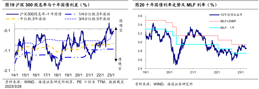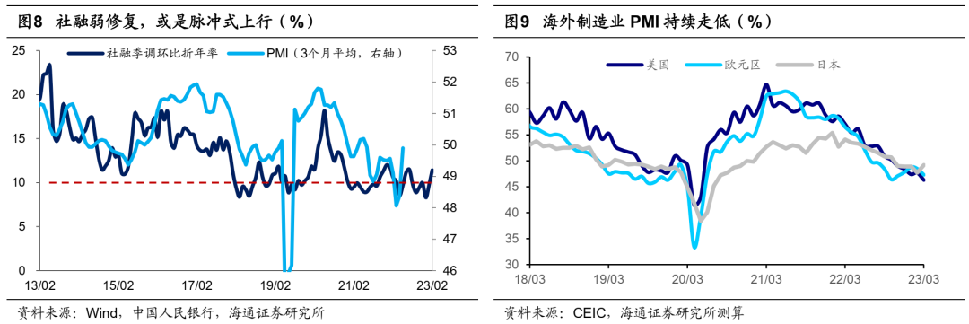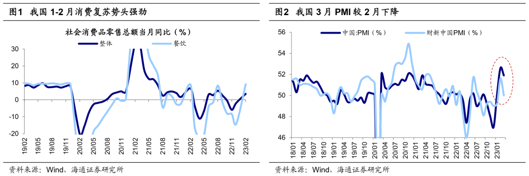 国内1、2月经济强劲复苏,3月经济修复斜率趋缓。随着疫情对经济的影响逐步消退,23年1-2月宏观经济运行已呈现回升态势,消费、地产数据明显改善,基建和制造业投资保持较高增速,但由于海外通胀高企、需求持续降温,出口仍有下行压力。进入3月,国内经济复苏斜率有所放缓。3月制造业PMI为51.9%,仍处于荣枯线上,反映经济复苏仍在继续;但PMI较2月下降0.7个百分点,逆季节性回落也反映经济恢复基础仍不稳固。消费继续修复,但结构有所分化,线下餐饮、娱乐消费仍在修复,但3月汽车零售同比、家电线上线下销售额同比仍在负值区间。出口方面,海外主要经济体PMI指数均有明显回落,3月欧元区制造业PMI下降至47.3,美国制造业PMI下降至46.3,海外需求或延续降温趋势,我国出口依然有下行压力。总体来看,相比于1、2月的高斜率修复,3月以来国内供需两端修复有所放缓。
