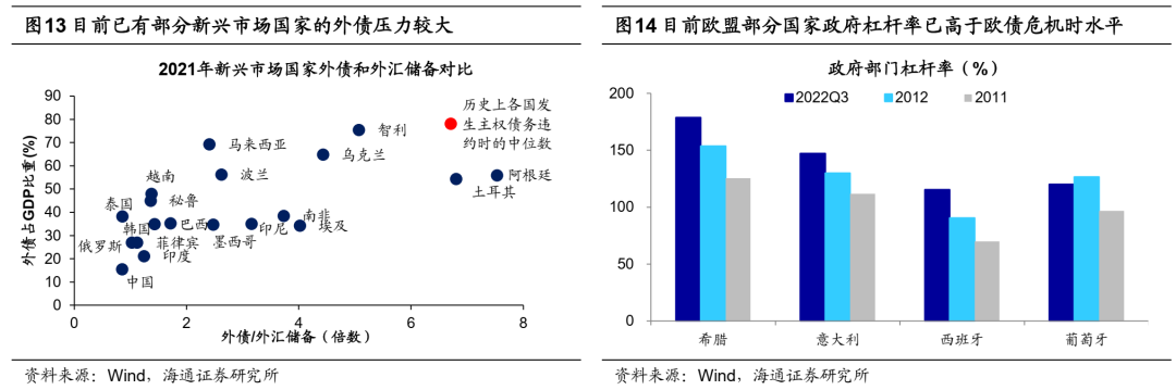 未来部分新兴市场国家、欧元区部分高杠杆国家以及日本的债务风险值得警惕。这次美联储激进加息下,硅谷银行、瑞信等海外金融机构已发生风险事件。目前来看,海外银行业演变成系统性金融危机的概率还相对较低,但在全球高利率环境下,海外风险因素或已在悄然间持续累积,我们认为还需警惕来自其他海外国家的风险事件冲击,如新兴市场国家、欧洲以及日本。根据IMF统计,目前新兴市场有约2370亿美元的外债面临违约风险,25%的新兴市场国家接近债务困境,未来土耳其、阿根廷、智利等新兴市场国家的主权债务风险存在愈演愈烈的可能。在目前欧洲弱经济、高通胀、紧货币的宏观环境下,欧元区部分高杠杆国家的主权债务或同样存在隐忧,如希腊等。日本方面,若未来当地迫于通胀压力放弃YCC政策,利率上升后日本政府的账面亏损和偿债成本将显著增加,届时叠加羸弱的经济基本面,由此引发的日本债务危机也存在波及全球的可能,详见《硅谷银行倒闭折射的海外风险——23年海外灰犀牛系列1-20230312》。若二季度以上海外国家债务风险暴露,或对二季度市场行情形成扰动。