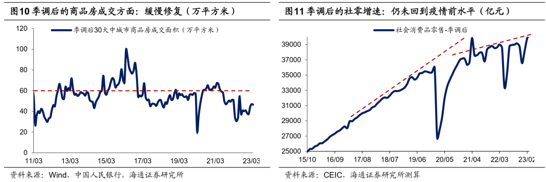 下一阶段,经济修复斜率或有可能放缓。从外需看,海外通胀压力导致货币收紧,高利率压制需求,且叠加欧美银行业动荡冲击,海外主要经济体3月PMI均有回落,海外需求降温或进一步拖累出口。从内需看,一方面,一季度地产销售的回暖或只是短期现象,市场信心仍未修复,所以当前土地交易仍在低位,地产基本面企稳或需要更长时间。另一方面,消费并没有报复性反弹, 1-2月的社零增速仅有3.5%,消费增速较疫情前下了台阶。进入二季度,随着居民的收入预期有所修复,消费需求或将持续释放,叠加去年同期的低基数效应,预计二季度社零增速明显回升。但收入增长预期偏弱、超额储蓄不足且结构分化,居民消费释放的高度或相对有限。从当前跟踪的高频数据来看,截至3月底,生产、消费等多项高频指标的环比增速均在放缓,但是由于基数的走低,同比读数走高。