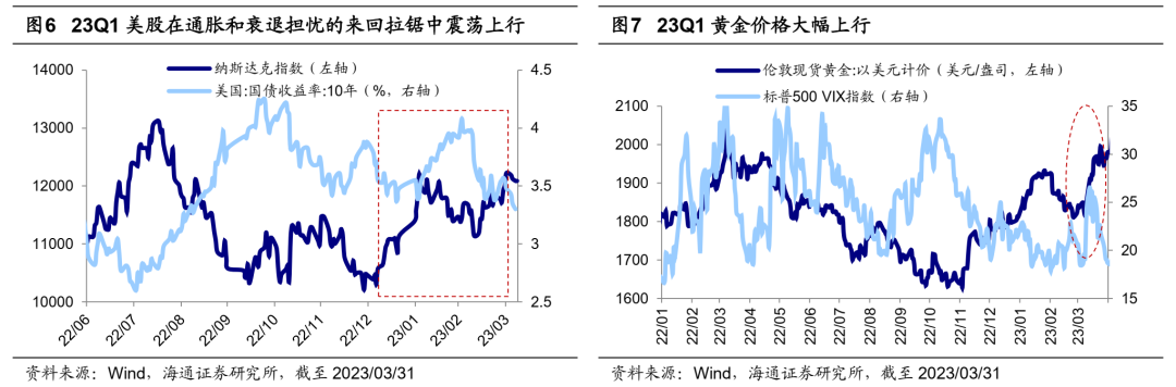 23Q1大类资产表现:权益和避险资产表现较优,其他大宗商品表现较弱。具体来看,23年一季度海外银行业风险事件发酵使得市场对经济衰退的担忧升温,美联储加息预期明显放缓,推升了黄金的价格,23Q1(截至23/03/31)中COMEX黄金涨9%。美欧经济仍在下行趋势中,且在银行业风险事件发生后,市场加深了对美欧经济衰退和大宗商品需求不振的担忧,今年一季度ICE布油跌7%、CRB指数跌4%。