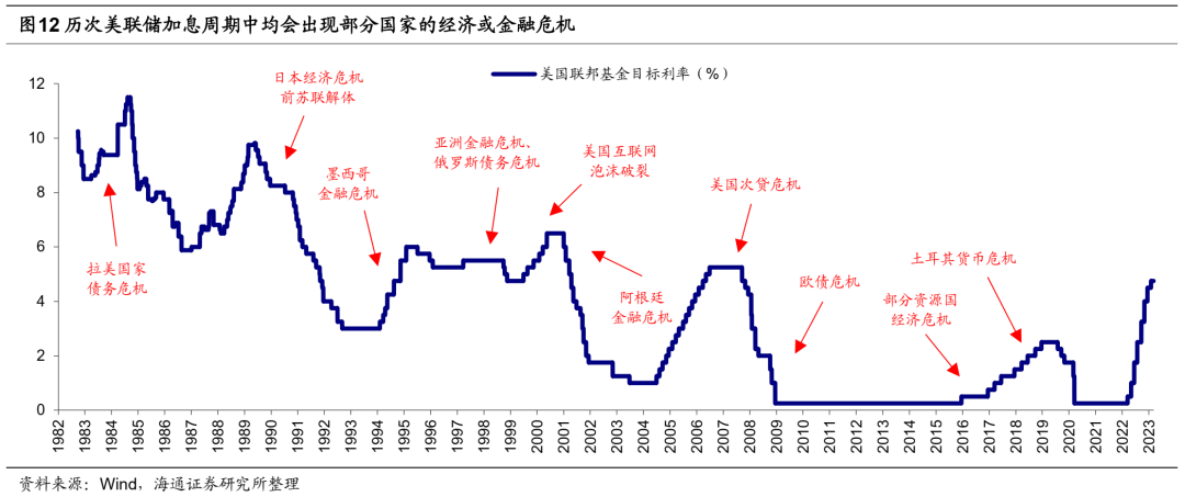 海外扰动:二季度需担忧美联储紧缩“后遗症”,部分国家债务风险可能暴露。我们还需分析美欧经济及国际局势,作为大类资产配置的辅助。当前海外仍处在美联储加息周期中,历史上美联储6轮加息周期都爆发了经济或金融危机,原因在于美债利率是全球金融资产的“锚”,美联储加息往往触发高杠杆国家或机构的危机。例如第1轮加息周期(1983-1984年)爆发了拉美国家债务危机;第2轮加息周期(1988-1989年)日本跟随式加息导致其国内房地产和股市的崩盘;第3轮加息周期(1994-1995年)引发了亚洲金融危机;第4轮加息周期(1999-2000年)美国互联网泡沫破灭,美国经济走向衰退;第5轮加息周期(2004-2006年)美联储加息刺破房地产泡沫,次贷危机最终升级成全球金融危机,也为欧债危机埋下祸根;第6轮加息周期(2015-2018年)土耳其发生货币危机。