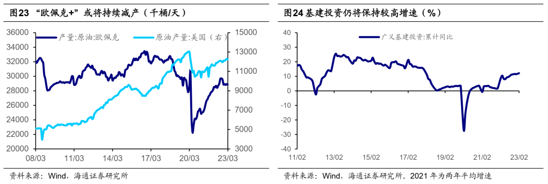 原油价格或延续震荡格局。从需求端看,高利率环境下海外需求回落,中国经济修复斜率或将放缓,对原油的需求短期难有明显改善。从供给端看,在维持之前的原油减产协议不变的前提下,4月2日“欧佩克+”又宣布从5月起至2023年底自愿削减产量,包括沙特阿拉伯、俄罗斯、伊拉克、阿联酋等国纷纷宣布减产计划,总计减产量高达165万桶/日。受供需两端均走弱影响,二季度原油价格或继续震荡。