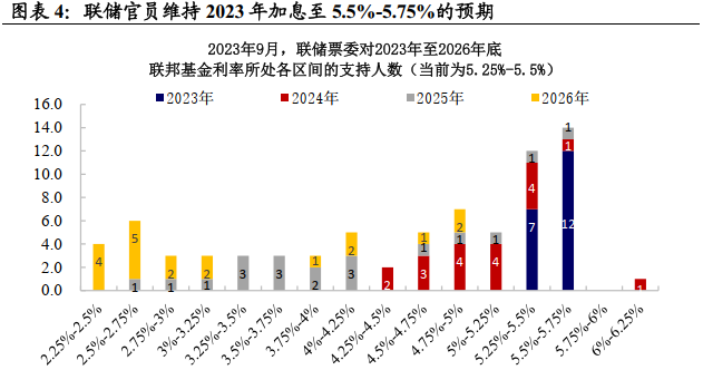 点阵图维持年内加息至5.5%-5.75%的预测,且24、25年利率中枢上移。与6月SEP相比,9月联储官员点阵图显示2023年终点利率与此前一致,而2024年和2025年利率中位数水平上移50bp。“stay higher for longer”得到了进一步的体现,高利率或将维持更长的时间——参与SEP预测的联储官员19人中,有12人预期联邦基金利率2023年底升至5.5%-5.75%,7人同意维持当前利率不变;到2024年,点阵图中位数由此前的4.5%-4.75%抬升至5%-5.25%,且点阵图分布区间变小,预测最小值落在4.25%-4.5%,19名官员中10人认为2024年仍然需要维持5%以上的高利率;2025年的利率中位数也由此前的3.25%-3.5%上行至3.75%-4%。按照点阵图指引,今年年内还剩1次25bp的加息,而明年降息幅度十分有限。