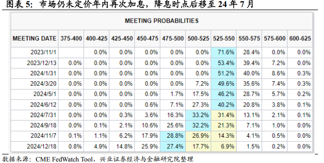 当前市场并未充分定价联储的higher和longer:当前市场定价年内不再加息,而明年7月开启第一次降息,年内利率降至4.75%-5%。市场整体比联储指引低25bp,且降息时点偏早。