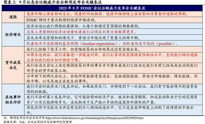 经济判断:大幅上修今明两年GDP增长预期,并下调失业率预期。本次联储官员对于美国2023年经济增长的预期与6月相比大幅上调,从1%上修至2.1%,而失业率预期从6月的4.1%下修至3.8%。当被问到如何看待软着陆时,鲍威尔认为软着陆并不是联储的基准预期(baseline expectation),因为相比抗通胀的首要任务经济增长可以让步,但软着陆仍是可能的(possible)。