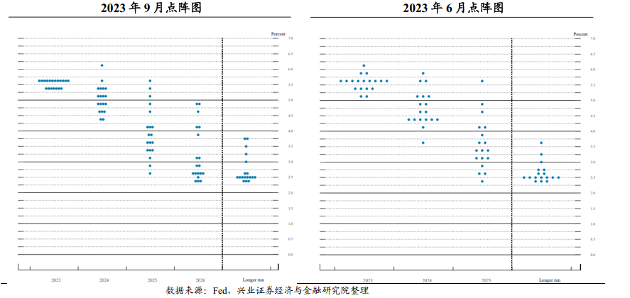 点阵图:维持年内加息至5.5%-5.75%的预测,24、25年利率中枢比6月预测上移50bp。参与SEP预测的联储官员19人中,12人预期今年年内再次加息25bp,7人同意维持当前利率不变;2024年利率指引来看,10人认为仍然需要维持5%以上的高利率,明年降息幅度或将十分有限。