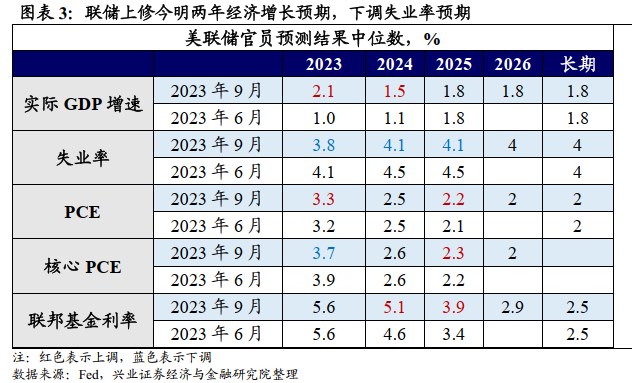 SEP:经济预期大幅上修,软着陆可能性上升,油价扰动下PCE轻微上调。本次联储官员对于美国2023年经济增长的预期与6月相比大幅上调,从1%上修至2.1%,而失业率预期从6月的4.1%下修至3.8%,2023年PCE和核心PCE水平预期分别调整至3.3%和3.7%。