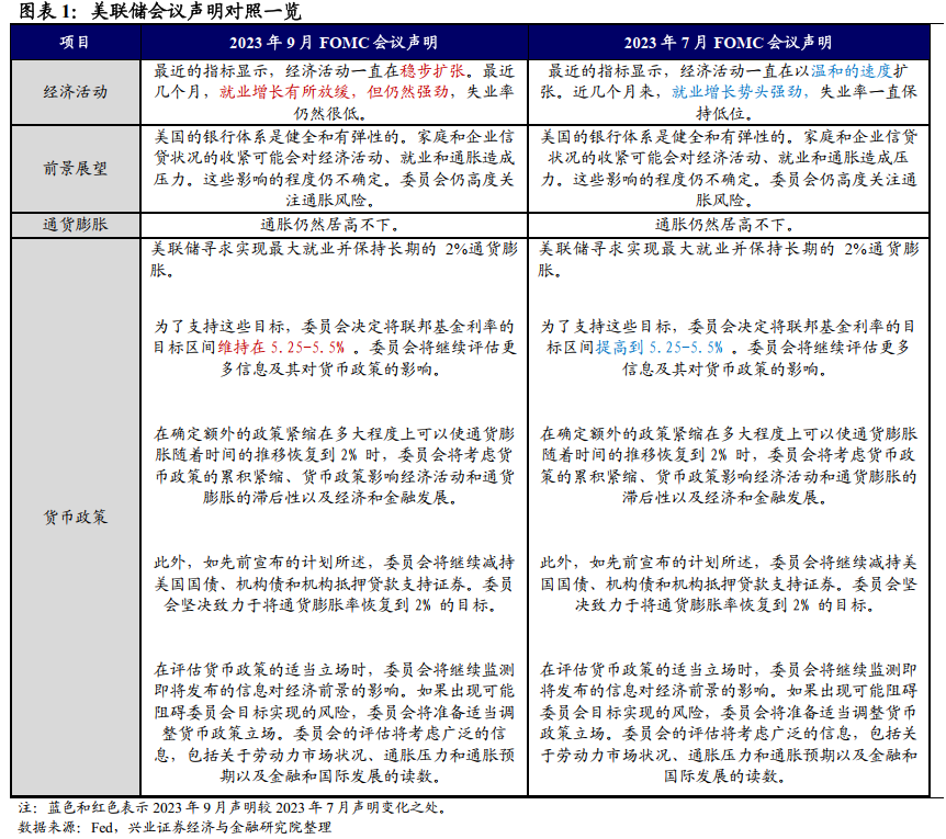 加息路径:如期暂停加息,开放年内再次加息可能性。9月FOMC如期暂停加息,为6月FOMC后本轮加息周期中的第二次暂停,联邦基金利率的目标区间维持5.25%—5.5%的水平,全部参会的联储官员表示赞成。关于后续加息的可能性,鲍威尔在会后的新闻发布会上表示,如果合适的话,联储准备进一步提高利率(We're prepared to raise rates further if appropriate)。降息时点鲍威尔并未给出过多讨论,“这一时刻肯定会到来”,但年内不会降息已经成为共识。