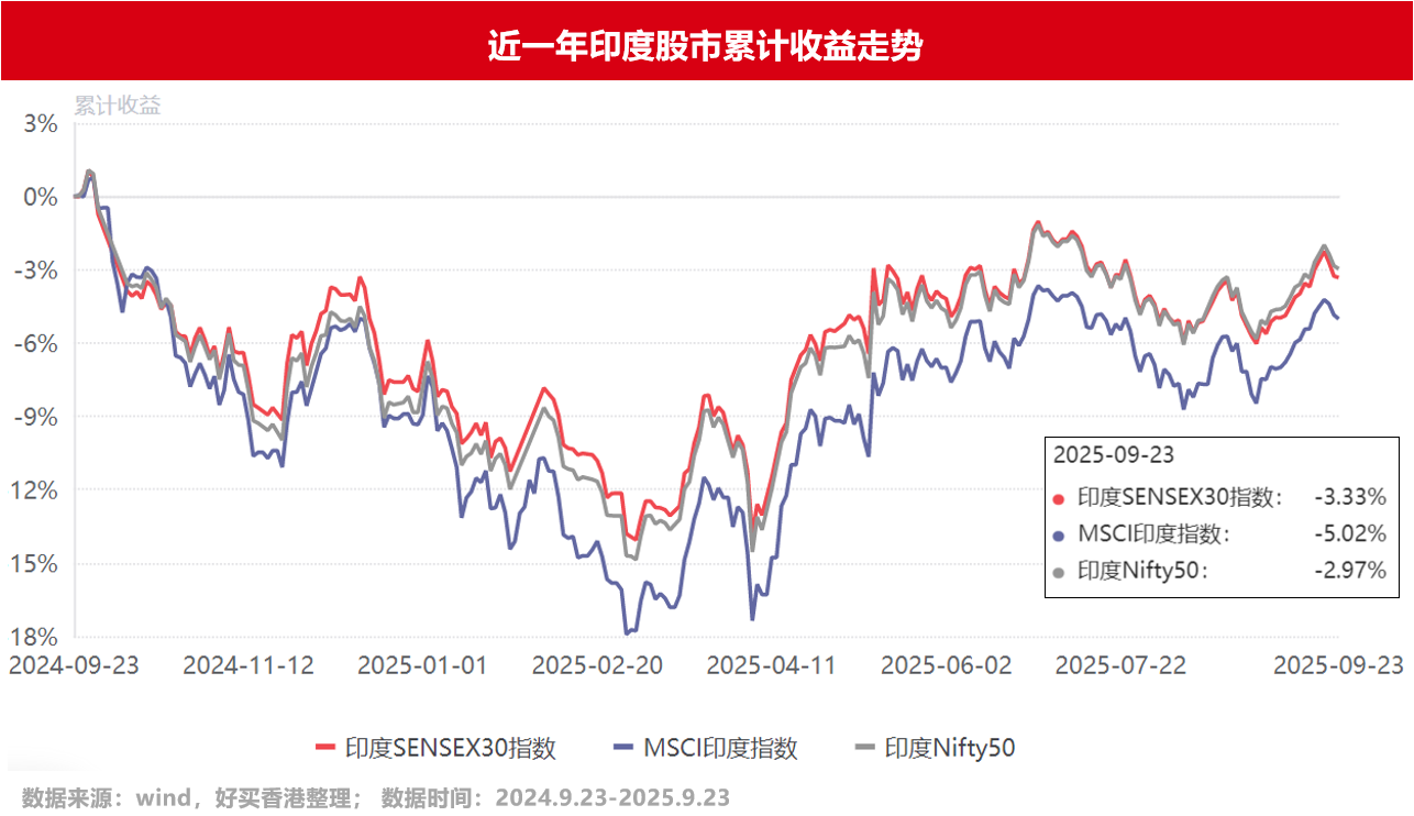 根据Wind数据显示,近一年印度SENSEX30指数累计下跌3.33%(截止9月23日),主要原因包含疲软的企业财报、外资持续撤退以及特朗普挥舞关税大棒,其中外资加速撤离是影响因素股市的最大主因,自去年9月底以来,外资净卖出额已超270亿美元。