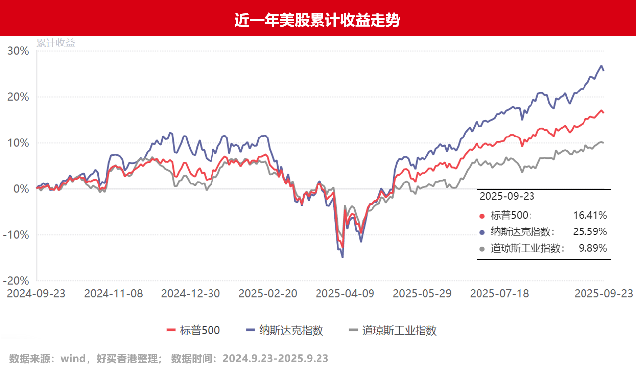 截止9月23日,标普500指数已实现年内第28次创新高,近一年累计收益已达16.41%,而以科技股为主的纳斯达克累计收益也已超25%。AI浪潮下,英伟达、苹果等科技巨头凭借股价的强劲表现,推动美股不断上涨。那在企业盈利支撑美股慢牛的同时,降息周期的继续,也使得美股或迎来更为舒适的流动性与政策环境。