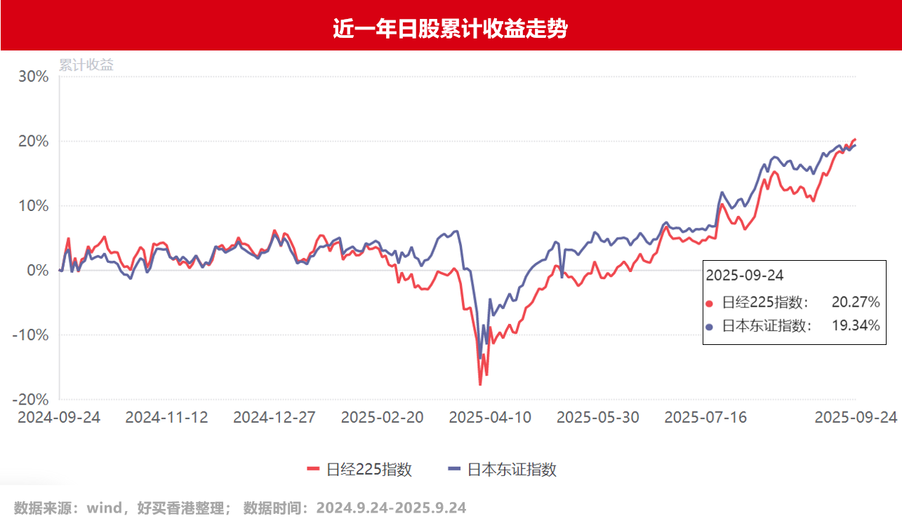 日股市场今年的震荡局面也吸引了众多投资者关注。前有特朗普的关税冲击,后有日本首相的辞职风波,而日本股市却连续创出历史新高。截止9月24日,日经225指数近一年的累计收益已接近20%,目前点位已突破45600,一度似乎要被“忽视”的日股,已默默在这波全球市场中积极表现。