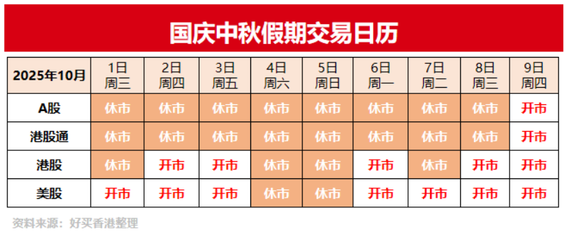 港股市场国庆和中秋各休一天,分别是10月1日和10月7日休市,其他工作日正常交易。也就是10月2日、3日、6日、8日这四天,虽然A股休市,但港股正常交易,这期间港股的表现或提前反映A股节后第一天的行情。