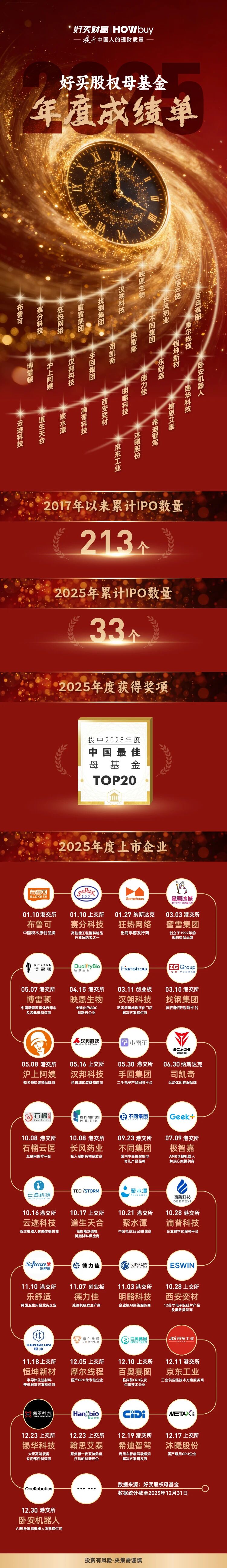 2025年,好买股权母基金坚守长期价值投资,聚焦人工智能、硬科技、新能源、消费及高端制造等多个核心赛道,以“募、投、管、退”全周期闭环能力,交出高质量成绩单,尽显头部母基金的专业实力与责任担当。