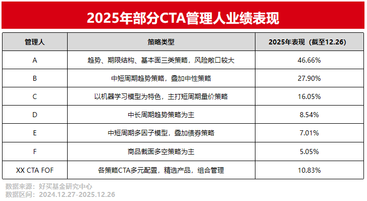 我们再来看看2025年CTA的业绩表现。以下统计了部分CTA管理人以及各类CTA多元配置的CTA FOF去年全年的收益情况。