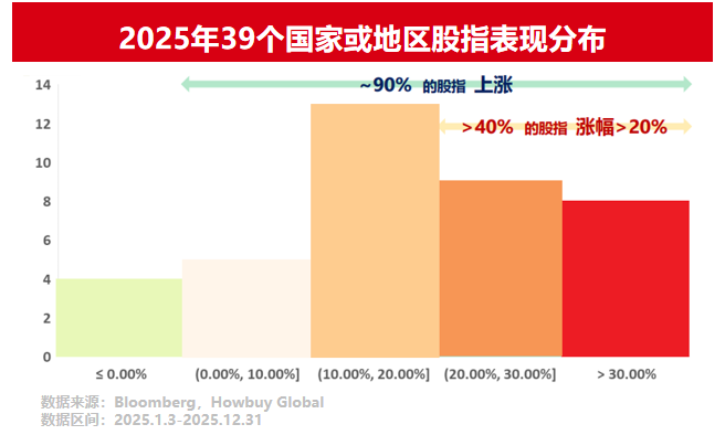 2025年全球股市迎来了普遍性的上涨,美联储延续降息与货币宽松,AI产业周期继续推进,全球主要股票市场中,约90%的股指实现上涨,超40%的股指涨幅逾20%。