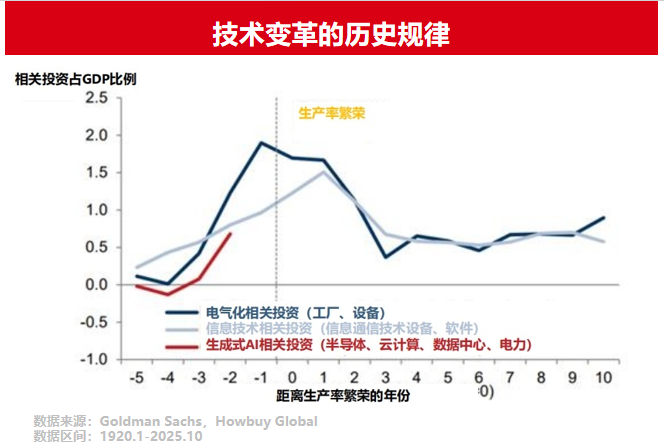 回看过往技术变革的历史规律,对比曾经的电气化革命和信息技术革命,AI革命的路还很长,距离生产率繁荣的顶峰或仍有巨大空间。
