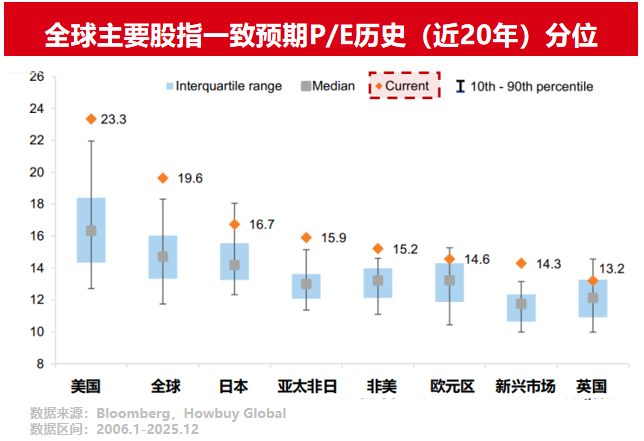 看全球股市当前估值情况,各国股市普遍处于历史估值的较高分位。