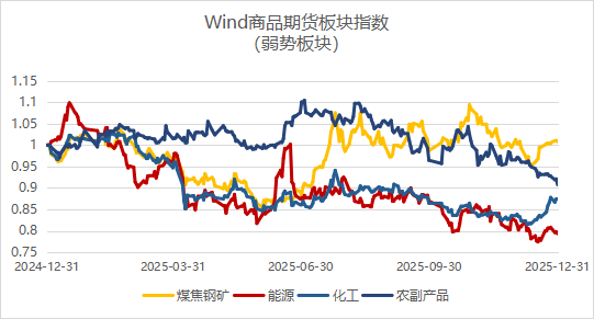 贵金属,有色金属板块在宏观地缘冲突、流动性宽松等环境下行情表现较强,像黑色产业链、能化等板块则受弱现实环境拖累,行情表现持续弱势。农产品表现多数偏弱,部分品种受自身基本面影响波动较大。此外,金融期货中,股指期货全年走势强劲,国债期货震荡偏弱,其中超长债出现明显下跌。