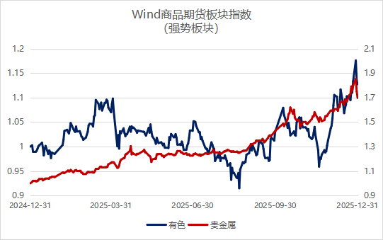 截至2025/12/31,贵金属板块涨幅超60%,有色金属板块也录得10%+的涨幅表现。能源、化工及非金属建材全年跌幅较大,都出现10%以上的下跌。4个股指期货全年同步上行,中证500、中证1000涨幅突出,分别超过20%。