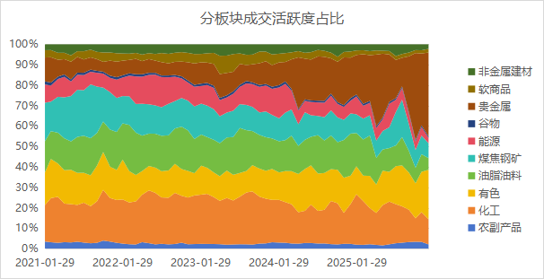 分板块看,贵金属和有色金属板块的活跃度占比有明显提升,贵金属成交占比从过往的10%左右提升到超30%,贵金属和有色金属也是今年大部分CTA的主要收益来源板块。