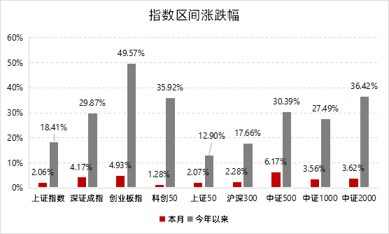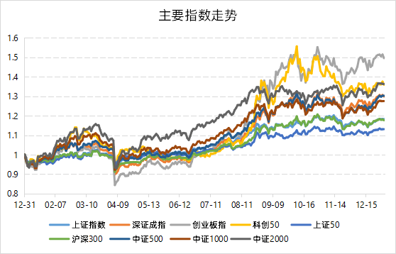 从全年表现来看,创业板指以49.6%的涨幅位居宽基指数首位,紧随其后的是代表小盘风格的中证2000指数,全年上涨36.2%。而上证50受大盘价值风格相对疲软的影响,表现较为温和,全年收益为12.9%。