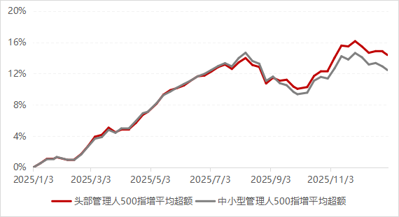 最后,我们观察了2025年头部量化管理人(规模超200亿)与中小型管理人的整体表现差异。