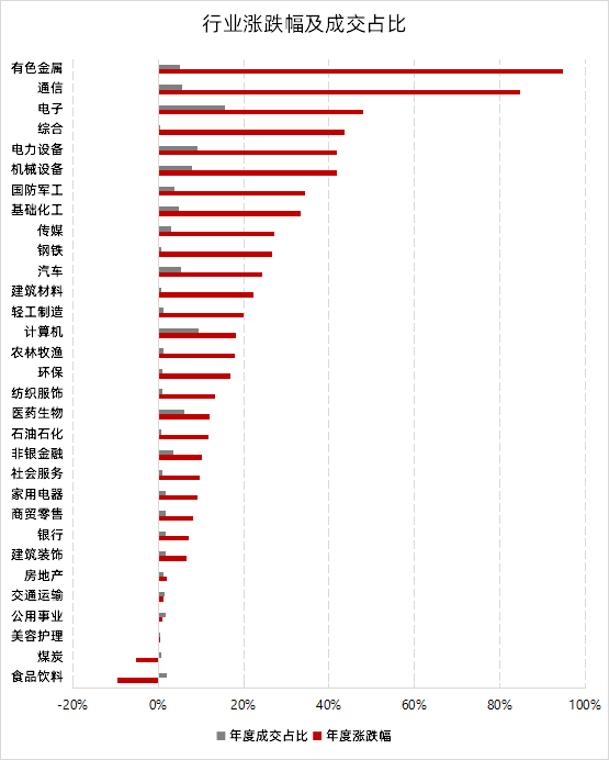 2025年A股市场的表现,呈现出清晰的“科技+资源”双主线驱动格局。从行业层面来看,有色金属板块受益于全球通胀环境、AI电力需求带动(如铜),以及地缘政治催生的避险情绪(如黄金),全年涨幅接近95%,在各行业中遥遥领先。与此同时,AI算力建设的提速与光模块等硬件需求的爆发,也强力拉动了通信与电子行业,两者涨幅分别位居第二和第三。