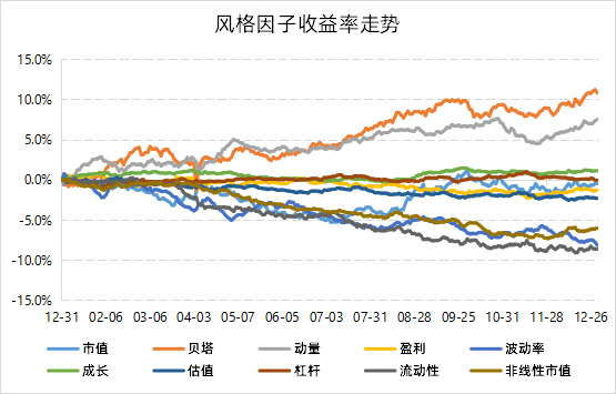 纵观全年,贝塔和动量因子表现尤为突出,这对应了量价风格在2025年的整体强势,也为常见的量价类策略提供了十分有利的运行环境。同时,在AI与新能源等板块的带动下,成长风格整体优于价值风格。相比之下,盈利、杠杆等基本面因子全年未能走出显著行情。