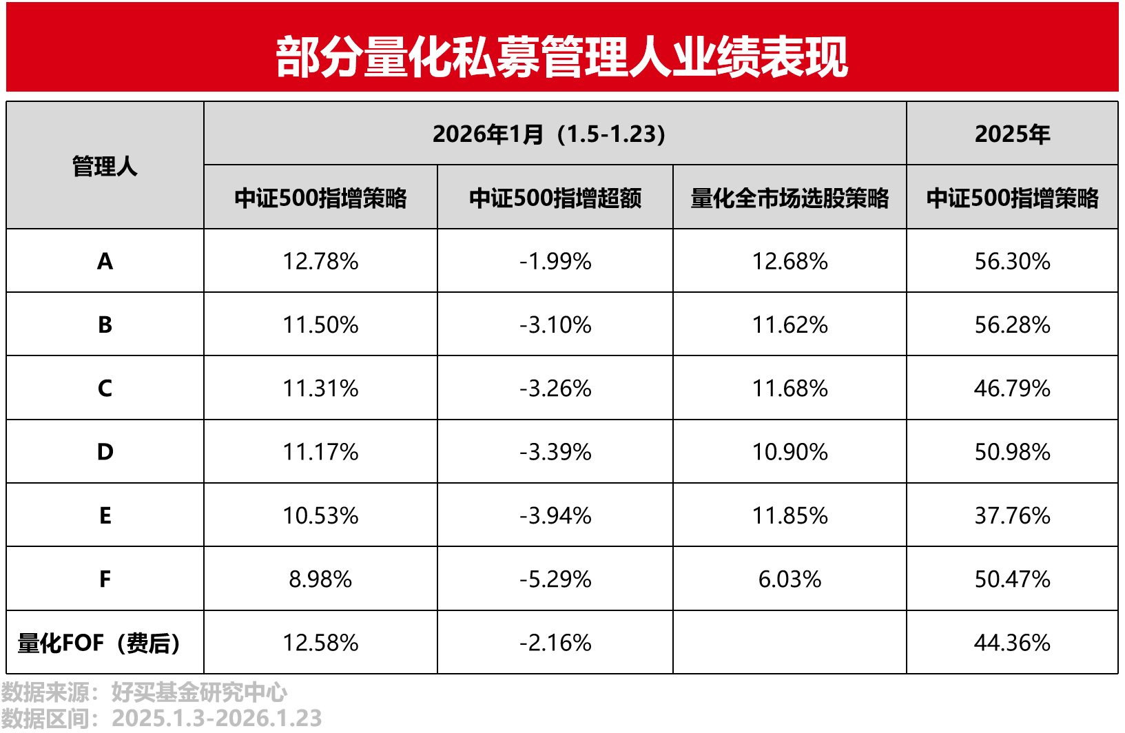 以下是部分头部量化私募管理人今年1月的业绩与超额情况。