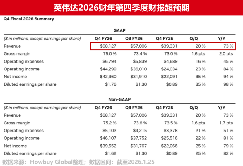 事件背景:当地时间2月25日,英伟达(NVIDIA)交出了一份远超市场预期的2026财年第四季度成绩单。财报显示,截至2026年1月25日,公司单季营收达681亿美元,同比激增73%,环比增长20%;净利润实现429.6亿美元,同比大幅增长超过90%,多项核心指标再度刷新历史纪录。