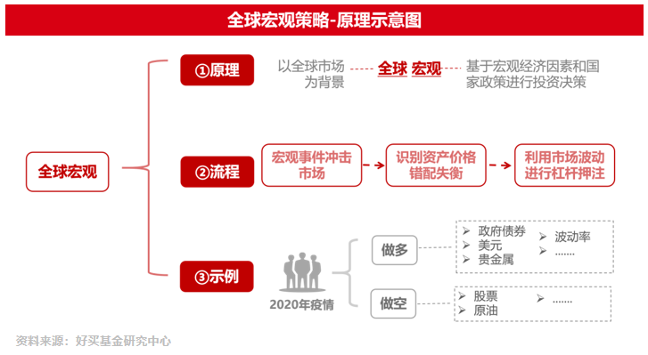举例而言,影响全球宏观经济的黑天鹅事件爆发后,管理人可能会做多贵金属,做空股票。根据全球宏观事件,捕捉各类资产的投资机会,这就是全球宏观策略。