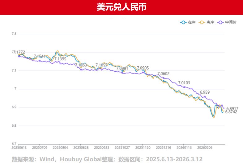 中间价、在岸价、离岸价保持高度一致,反映出央行强大的预期引导能力。背后有多重驱动因素:一是美国11日发布的通胀数据相对温和,市场仍担忧中东局势,美元指数逼近99关口;二是国内经济稳中向好,企业结汇需求释放,2月外汇储备规模为34278亿美元,升幅0.85%,为汇率提供坚实基础。