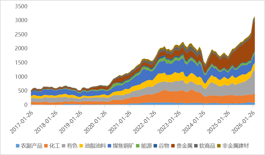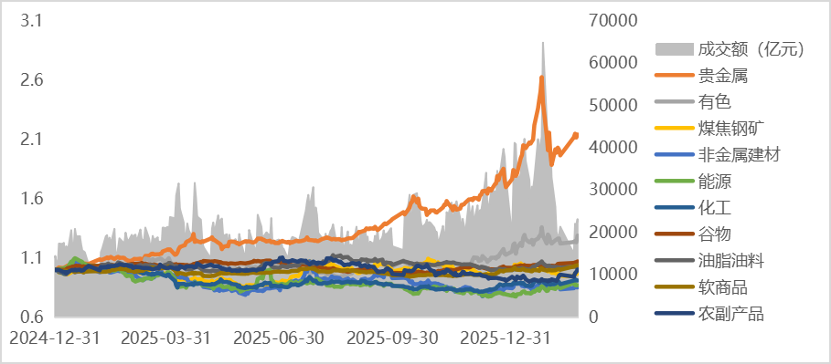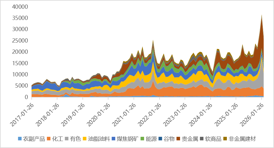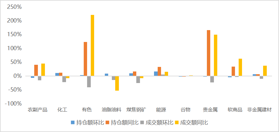 2月,商品日均成交额27024.93亿元,较上月环比下降-26.36%,同比增加56.47%,日均持仓额3149.92亿元,较上月环比增加3.63%,同比增加68.6%。分板块看,贵金属、有色等板块的持仓额及成交额同比明显放大。
