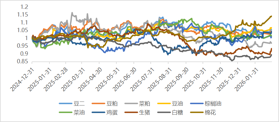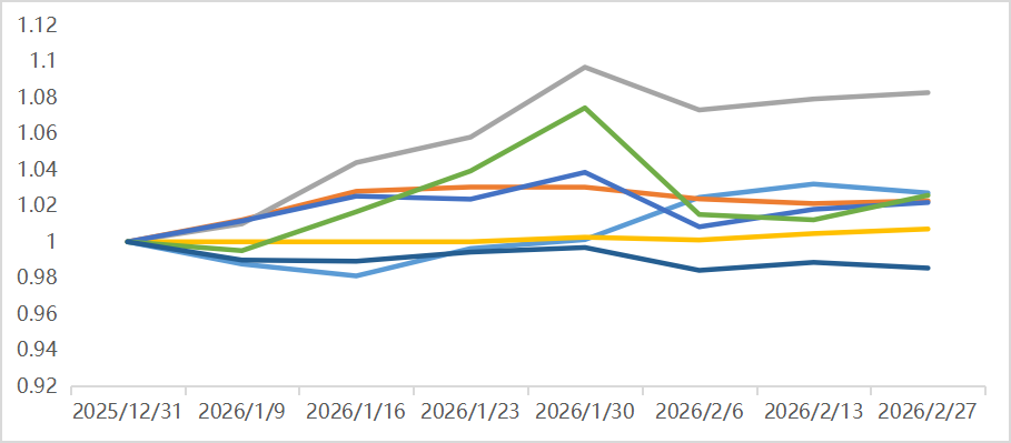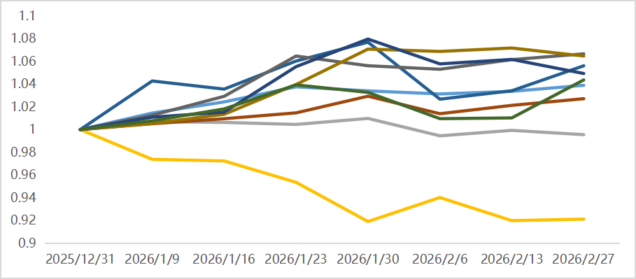 分板块看:贵金属在1月末冲上历史高位后,2月创下近几年最大月度跌幅,“沃什交易”和拥挤度较高或成主要原因。黑色建材板块也在地产行业不佳环境下继续弱势。农副产品中,玉米、鸡蛋等涨幅突出。其他板块品种总体震荡。股指期货2月表现同样突出,尤其在春节后实现开门红。