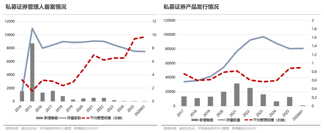证券私募行业在过去数年经历了供给侧改革。从管理人数量来看,如今整体有所下滑,存量已不足8000家,较高点减少约三分之一。与此同时,管理人平均管理规模有所上升,行业总规模约7万亿元,平均每家管理人规模约10亿元,行业整体运营水平显著提升。