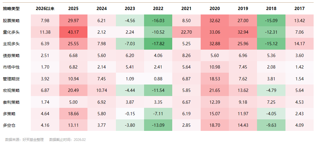 不同策略在不同市场环境下表现各异,2022年、2023年,债券、市场中性、管理期货等策略表现亮眼,配置这类资产能获得不错的收益;但2025年你会觉得有些难过,因为股票策略的收益表现更为突出。