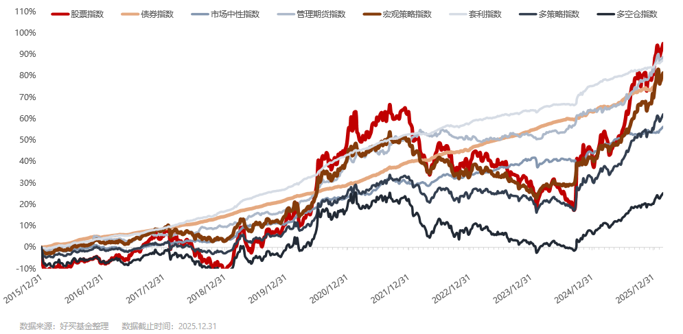 从2015年底到2025年底,近10年来,各私募策略指数的平均表现差异很大,选择不同类别的策略,结果肯定是不同的,过程也会非常不同。这只是指数层面的数据,具体到单基金,业绩分歧度极大,例如主观基金的业绩分化明显,这就凸显了选择的重要性。