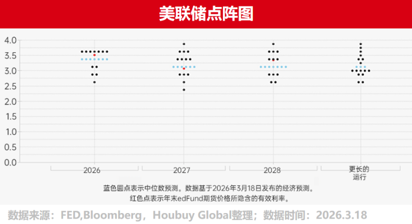 再来看第二个因素,3月底最新的议息会议暂缓降息,将联邦基金利率目标区间维持在3.50%-3.75%不变。美联储点阵图显示2026年仅降息一次,多位官员倾向不降息。
