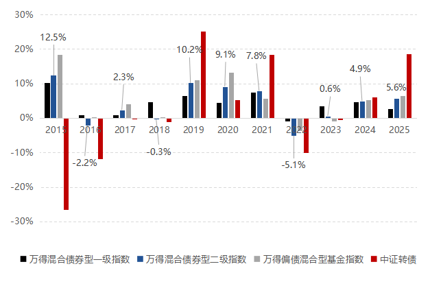 具体看,混合债券型一级指数走势最平稳,回撤控制极佳,仅2022年微跌0.81%,其余年份均实现正收益,是固收+中最稳健的品类,适合风险厌恶型投资者。混合债券型二级指数收益弹性更强,长期表现突出,2019、2020年收益领跑,2022年最大回撤仅5.07%,在稳健与收益间实现最优平衡,性价比突出。偏债混合型基金指数收益居中、波动平缓,十年间仅两次小幅回撤,兼具债基稳定性与适度权益弹性,适配多数稳健型资金。中证转债指数波动最大,2015、2016年调整明显,2019年强势反弹,弹性突出但回撤更大,具备进攻属性。