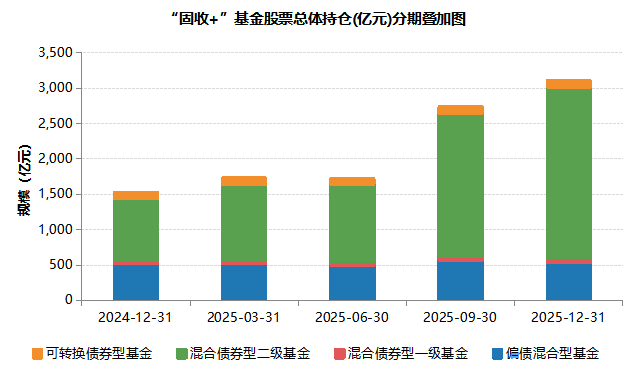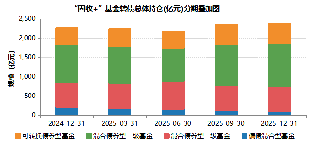 “固收+”的权益持仓方面,混合债券型二级基金股票仓位从2024年底的882.44亿元大幅提升至2025年底的2409.45亿元,在2025年三季度迎来跨越式增长,成为权益增强最积极的品类,与规模高速增长形成共振,彰显基金经理对股市行情的信心,通过高配股票强化收益弹性,是其规模领跑的关键原因。而一级债基金、偏债混合型基金和可转债基金的股票仓位基本稳定。