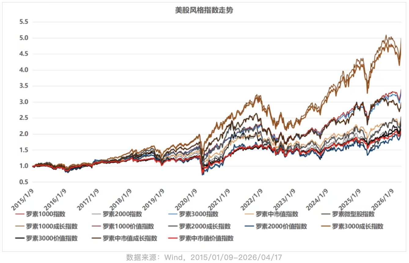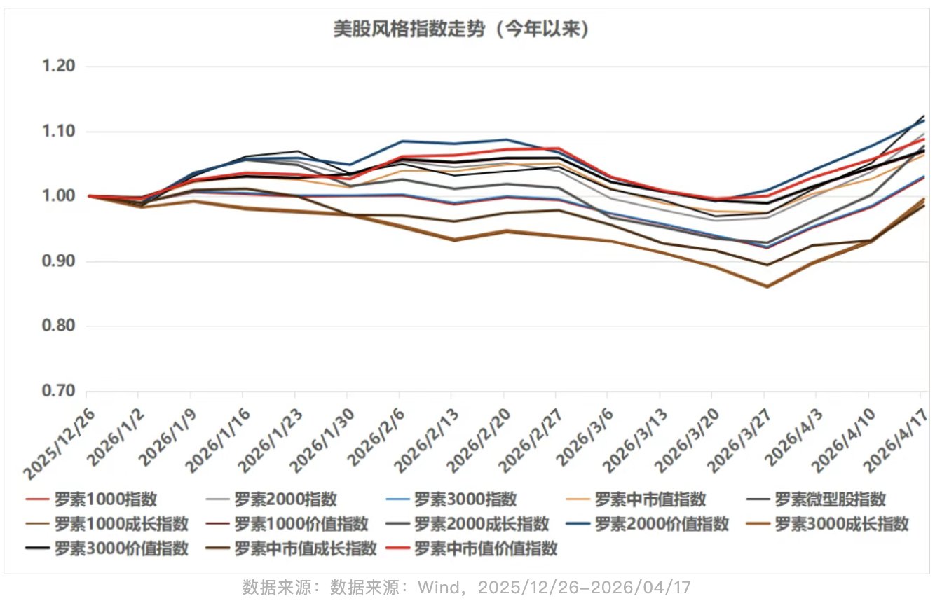 截至4月17日,罗素1000近一年上涨35%,罗素2000上涨48%,罗素微型股上涨73%;若只看2026年以来,罗素1000上涨约4%,罗素2000上涨约10%,罗素微型股上涨14%。